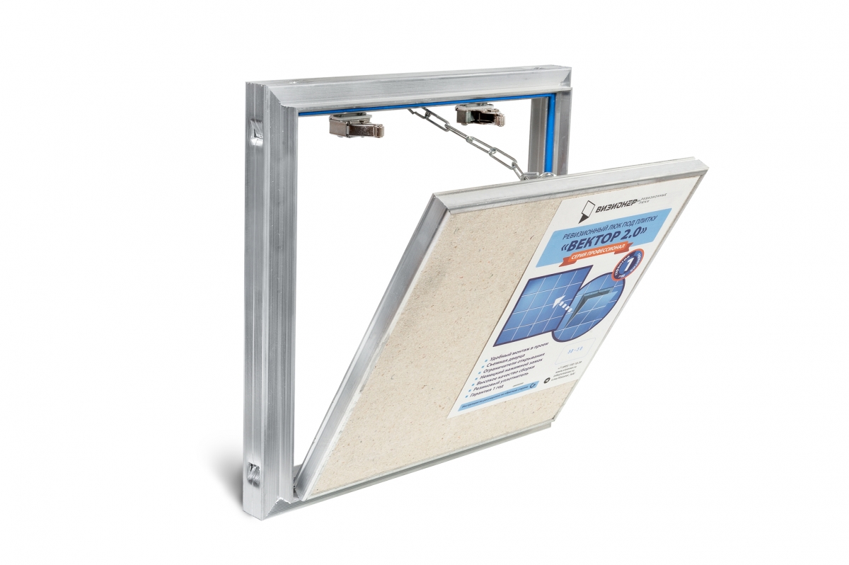 Люк под плитку «ВЕКТОР 2.0» повышенной прочности и жесткости с откидной, съемной дверцей, на которую наклеится абсолютно любые листовые отделочные материалы (керамическая плитка, керамогранит, натуральный или искусственный камень, различные композитные материалы и др.).